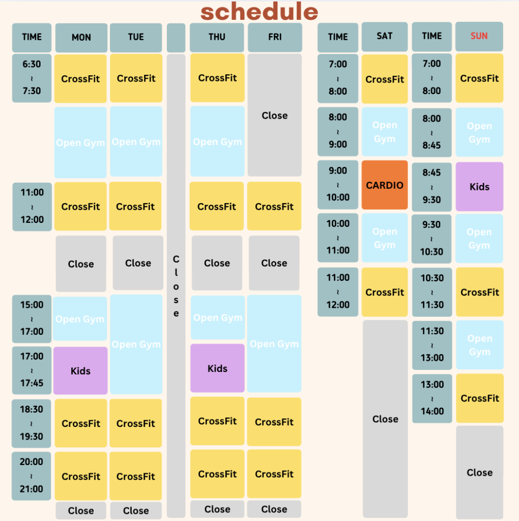 CrossFitは、日常生活で行う動作(歩く・走る・起き上がる・拾う・持ち上げる・押す・引く・跳ぶなど)をベースとした動きを高い強度で行い、全身を満遍なくトレーニングできるプログラムです。