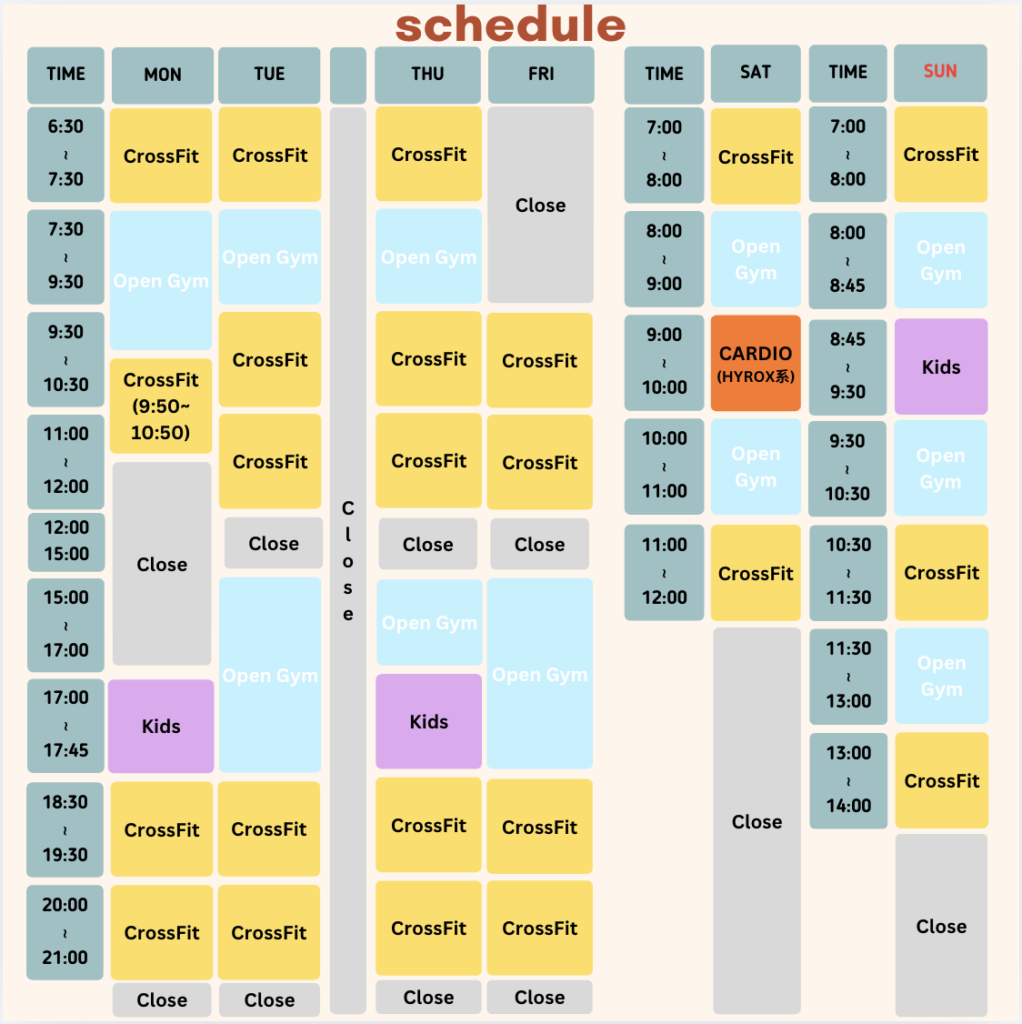 CrossFitは、日常生活で行う動作(歩く・走る・起き上がる・拾う・持ち上げる・押す・引く・跳ぶなど)をベースとした動きを高い強度で行い、全身を満遍なくトレーニングできるプログラムです。